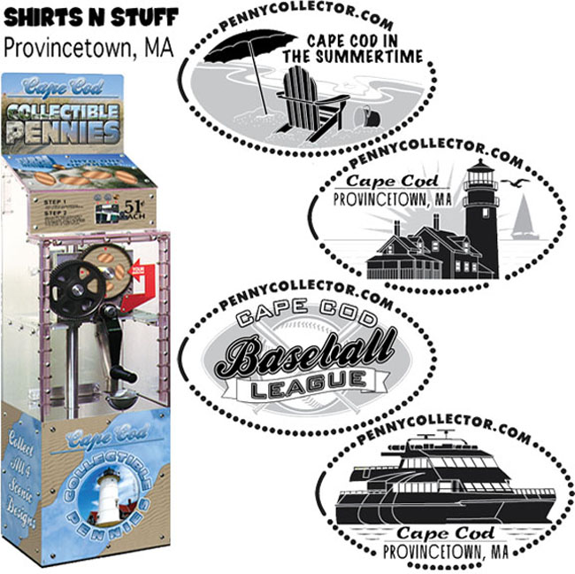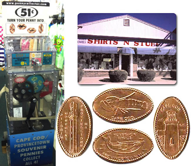 329 Commercial Street Provincetown, MA , 02657 Phone: (508)487-3414 Website Located on Commercial Street, the main road in town. Next to a restaurant called Burger Queen and another called the Lobster Pot. This store is "Shirts-N-Stuff". Handcrank machine. Penny collecting books are available inside the store.