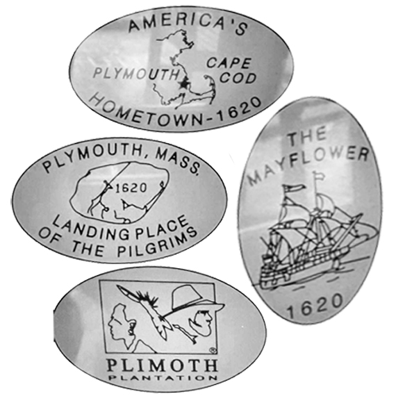 1) The Plimoth Plantation logo of a Pilgrim and an Indian,