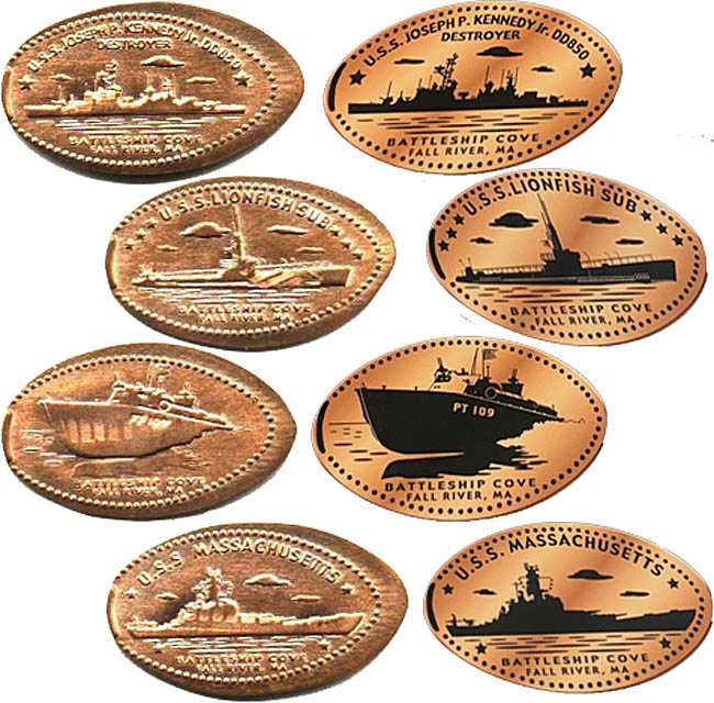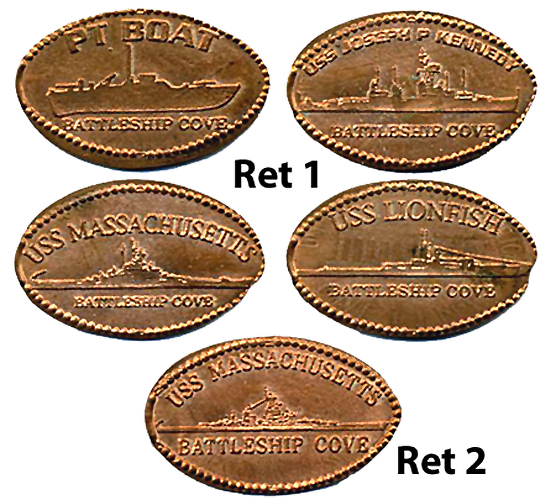 Machine 3 designs are now $1.01 to roll. All have 'Battleship Cove Fall River, MA' on them. The machine is now in the gift shop. Admission is not required to get the pennies Designs are: