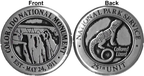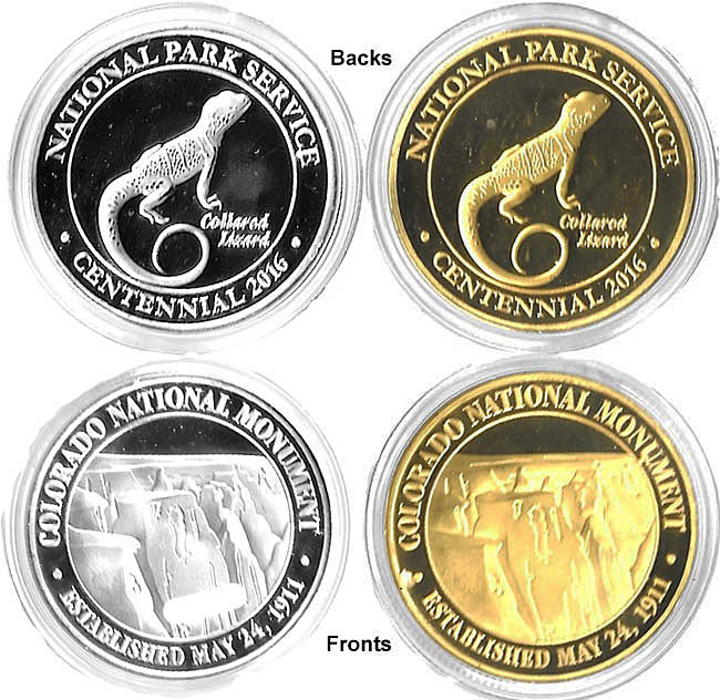 2) 'Colorado National Monument Established May 24, 1911', image of Monument/ Rear- 'National Park Service Centenial 2016, Collard Lizard', Silver color.