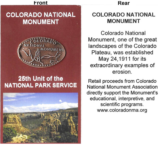 1) 'Colorado National Monument Established May 24, 1911t', image of Monument/ Rear- 'National Park Service Centenial 2016, Collard Lizard', Gold Color,