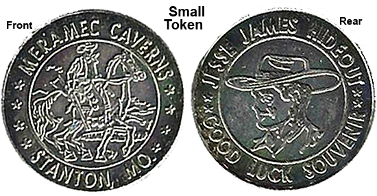 1) 'Jessie James Hideout, Good Lucky Souvenir' Jessie James' Head, Rear- 'Meramec Caverns Stanton, MO. ' Cowboy on a horse