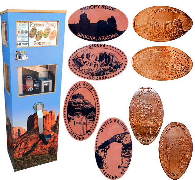 Machine 1 is outside in front of the store. Cost to press: 51¢ each design. Designs all have a beaded border with 'Sedona':