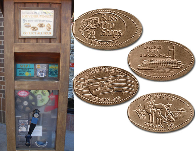 1 Bass Pro Drive Branson, MO , 65616 Phone: (417) 243-5200 Beautiful 4 die penny machine is located at Bass Pro Shops in Branson Landing.