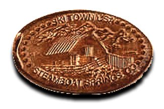 Design: Brown barn in front of mountains,' SKI TOWN USA ' on top, 'STEAMBOAT SPRINGS CO ' on bottom pressed horizontally..