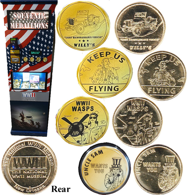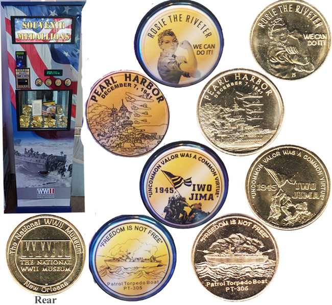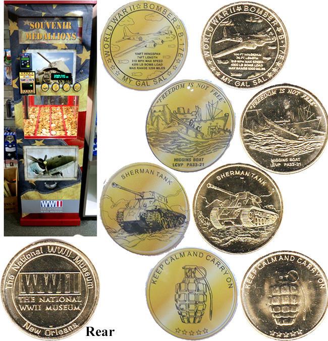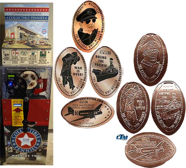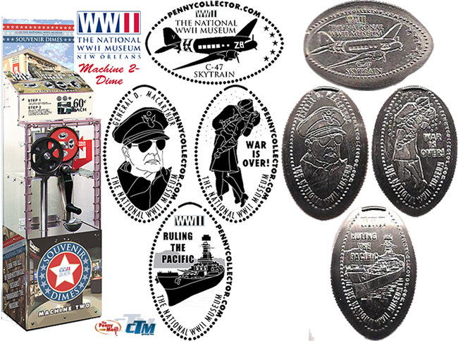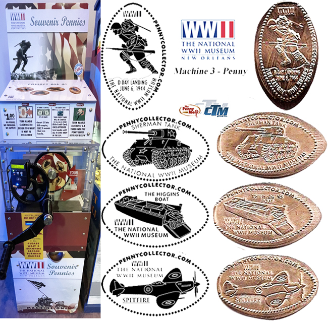 Machine 3 - Penny (machine is labeled Machine 1) is in the Louisiana Memorial Pavilion second floor by restrooms. Cost to press: $1.00 per design ($1 bill only) or use a credit card for all 4 for a $4 charge. Machine is pre-loaded with Zinc pennies. Designs all have a pennycollector.com beaded border with 'The National WWII Museum':
