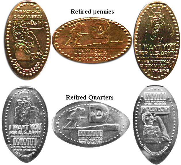 Retired 1: (Penny) ll had 'National "D" Day Museum New Orleans' on them: 1) (V) Rosie the Riveter with 'We Can Do It', 2) (H) Soldier running on beach with 'D' Day', 3) (V) Uncle Sam pointing with 'I Want You for the U.S. Army'.
