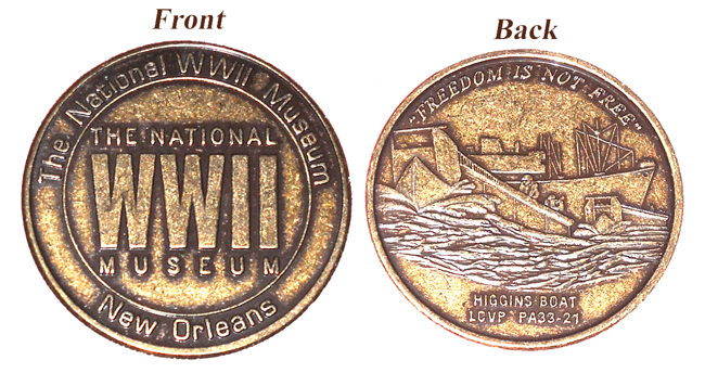 Retired Token Machine 1: 1) A Higgins boat in the ocean leaving a trawler with 'Freedom is Not Free. Higgins Boat LCVP-PA33-21/ Reverse: 'The National WWII Museum WWII The National WWII Museum New Orleans'.