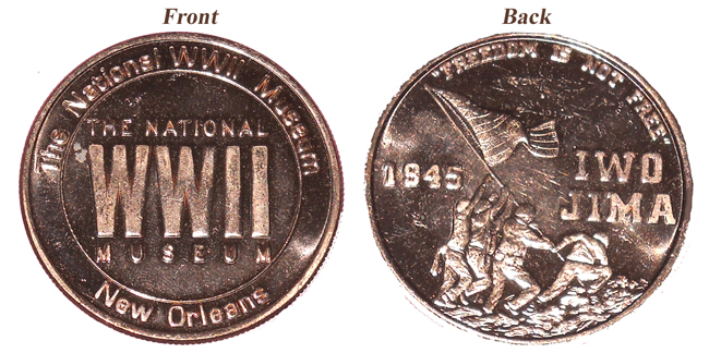Retired Token Machine 2: 1) 4 soldiers raising a US Flag with 'Freedom is Not free, Iwo Jima' 1945'/ Reverse: 'The National WWII Museum WWII The National WWII Museum New Orleans'.