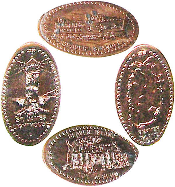 The designs consist of 1) Beaver Island Toy Museum 2) Beaver Island map 3) Beaver Islander ferry 4) St. James Lighthouse