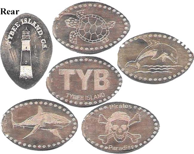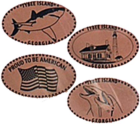 Retired 1: 1) Tybee Island Lighthouse, 2) Dolphins, 3) A Shark, 4) A flag with "Proud to be an American"