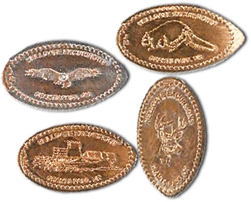 The machine is main level in Rock Shop near the ticket counter in back. Designs are; 1) Eagle 2) Beaver, 3) Elk or Deer (Vertical), 4) Boat.