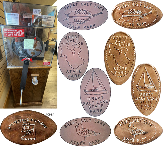Machine 1: Located by register. Cost is 51¢ each. All say 'Great Salt Lake State Park'. On back is State Parks Division of Wildlife Resources logo. Designs are: