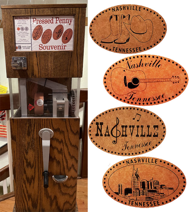 The machine is located near the back of the store. Designs all have 'Nashville, Tennessee' on them. They are: