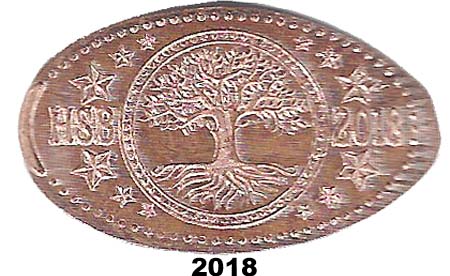 6) 2018: 'HSB 2018', Tree on a circle with HSB on left and date on right. Stars on sides |