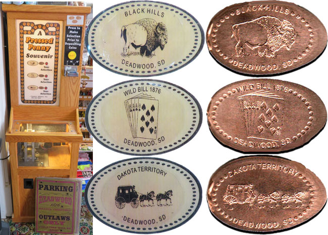 Machine 1 is in the middle of the gift shop. Cost to press: 51¢ each design. Designs all have a beaded border with 'Deadwood, SD':