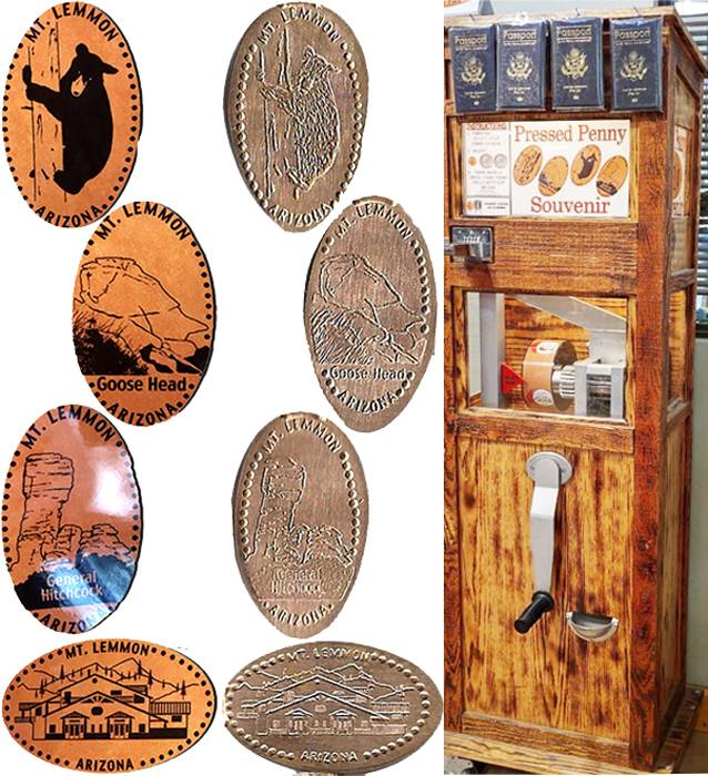 Machine 1 is inside front door on right. Cost to press: 51¢ each design. Designs all have a beaded border with 'Mt. Lemmon Arizona':