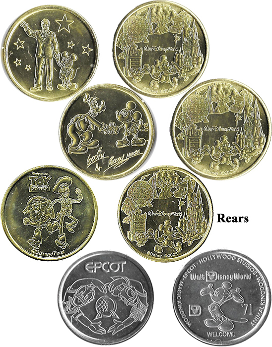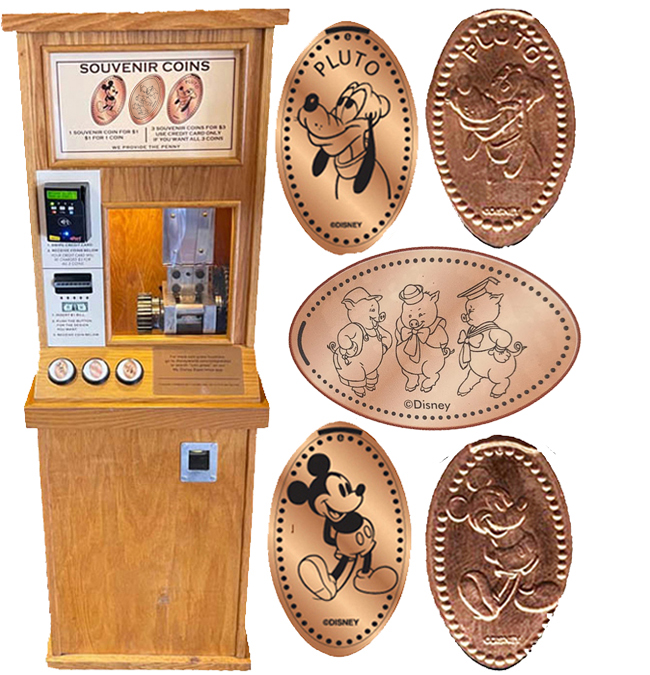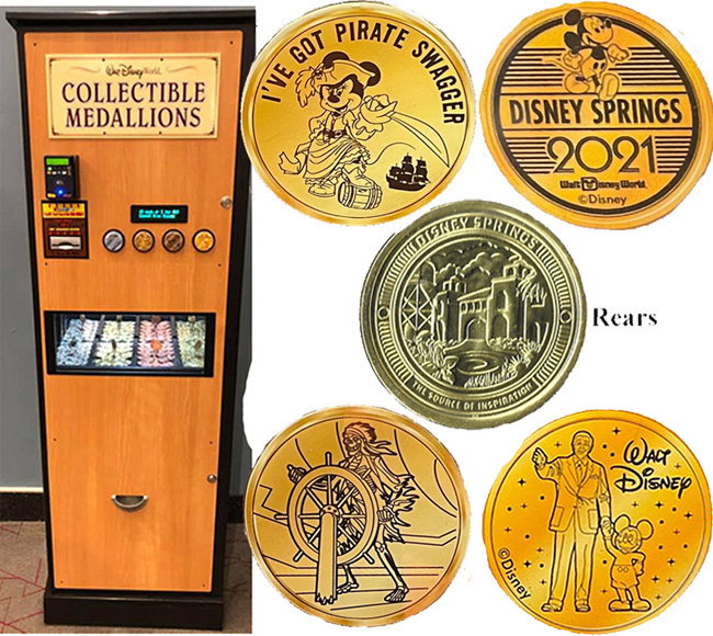 Retired Token Machine 2: 1) 'I've Got Pirate Swagger', Mickey with sword, 2) 'Mickey Mouse, the One and Only, 'M' 3) 'Pirate holding ships wheel 4) 'Walt Disney', Walt holding Mickey's hand facing forward.