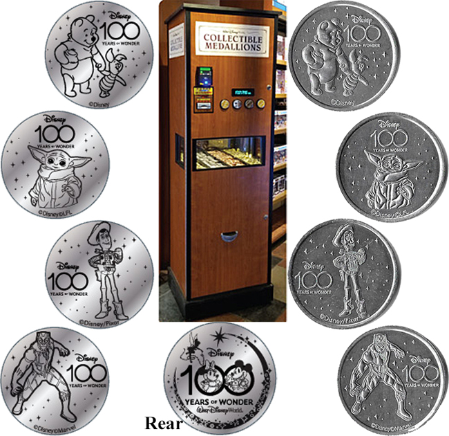Retired Token Machine 4: '100 Years of Wonder', 1) Grogu, 2) Woody, 3) Black Panther, 4) Pooh and Piglet. Rear- 100 Years of Wonder logo