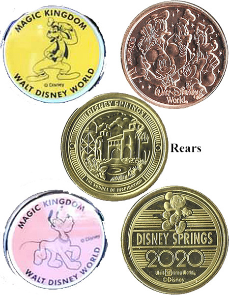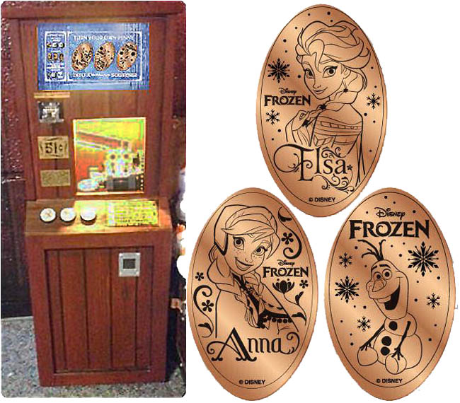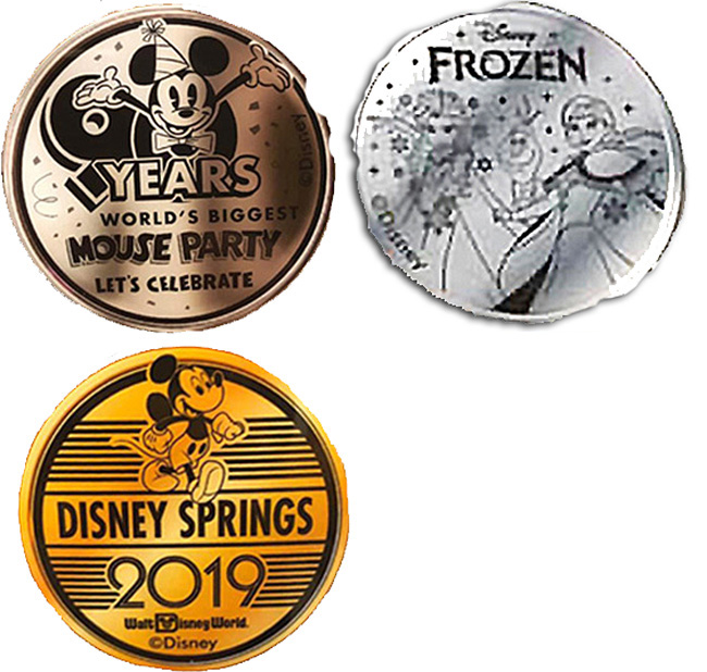 Retired from Token Machine 1: 1) 'Disney Frozen', Anna, Elsa, Olaf, 2) '90 Years, World's Biggest Mouse Party, 3) 'Disney Springs 2019', Mickey.