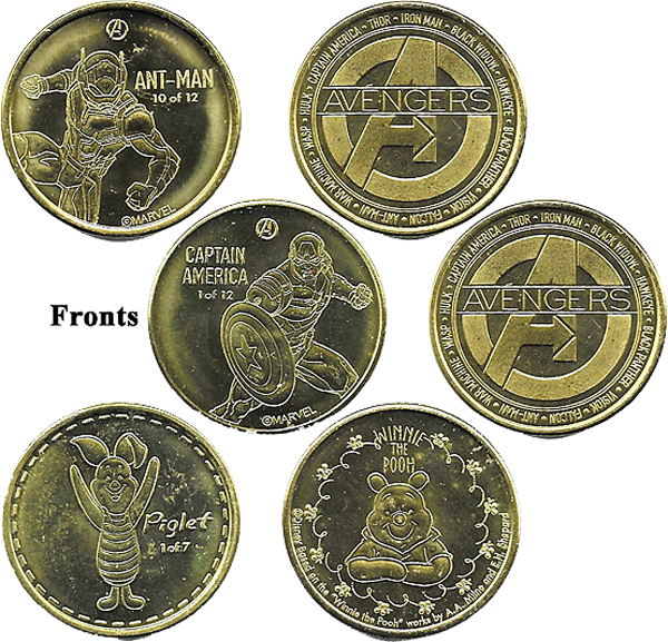 Retired from Token Machine 5: 1) Piglet 1 of 7/ Rear- Winnie the Pooh, 2) 'Captain America 1 of 12/ Rear- 'Avengers 'A', names of Avengers around the edge of the token, 3) 'Ant-Man 10 of 12'/ Rear- 'Avengers 'A', names of Avengers around the edge of the token,
