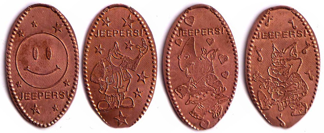 Retired Designs: 1) Monkey, 2) Cat playing a guitar, 3) girly girl Rhino, 4) happy face. All say "Jeepers!" |