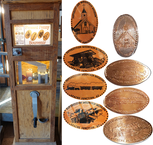 Machine 1 is inside the Apacheland barn in front of the general store gift shop on the left as you go in. Cost to press: 51¢ each design. Designs all have a beaded border with 'Superstition Mountain Museum Apache Junction, AZ':