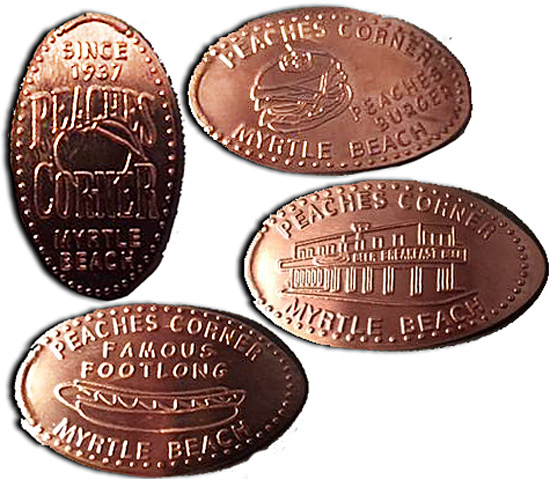 All have 'Peaches Corner Myrtle Beach' on them. The machine is to the left as you enter on the wall between booths. $.76 per design. Designs are: