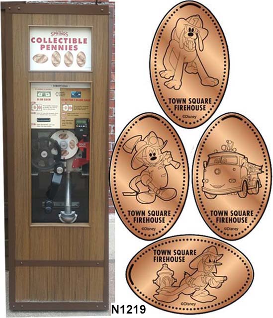 Each design costs $1 and they are pressed on pre-loaded Zinc pennies. Located in front of the bathrooms.