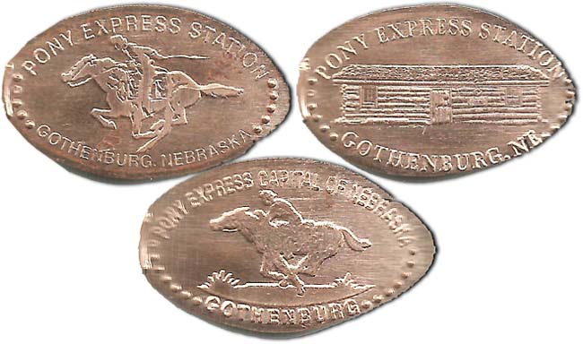 8/15/23: Machine is inside the original Pony Express Museum building made out of old time wood and mud in a park area. Check website for hours. It is inside the building,to the left. Electric machine. Same 3 designs as listed. In good working order.