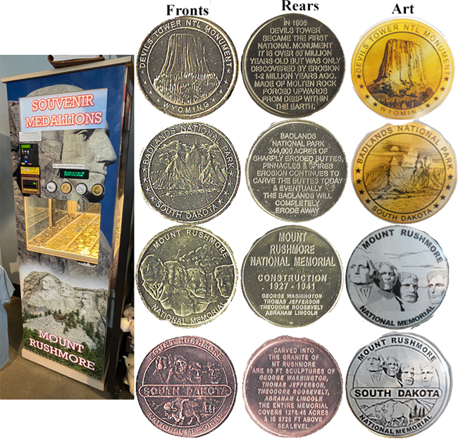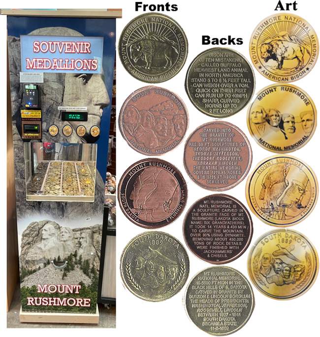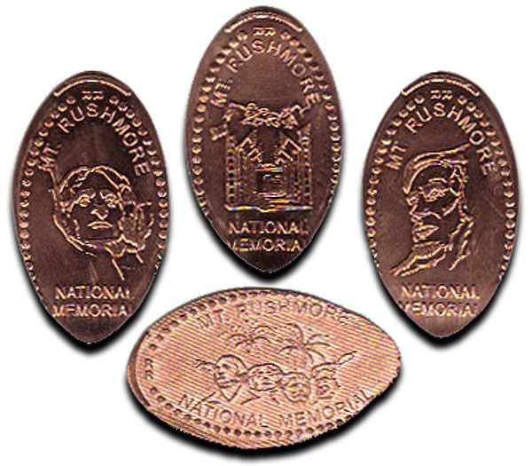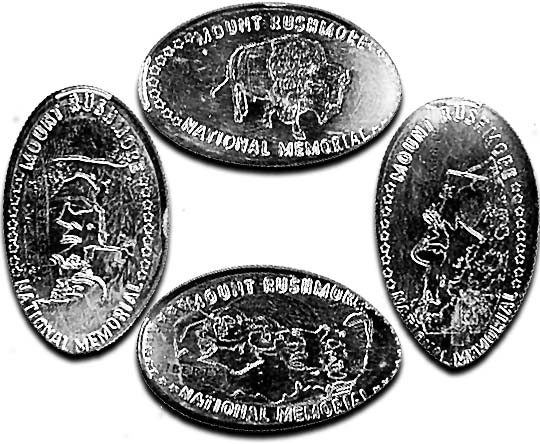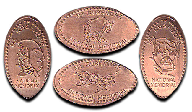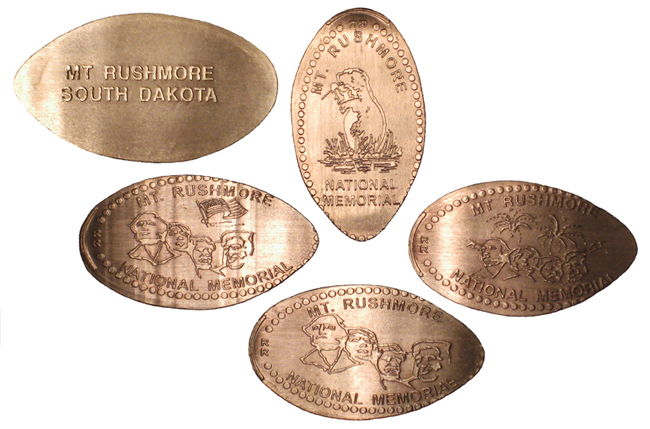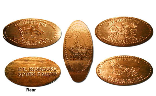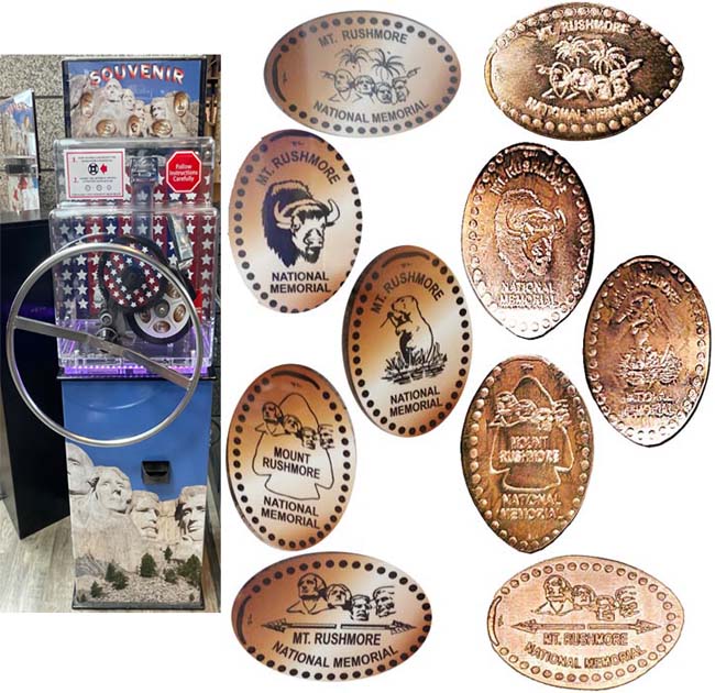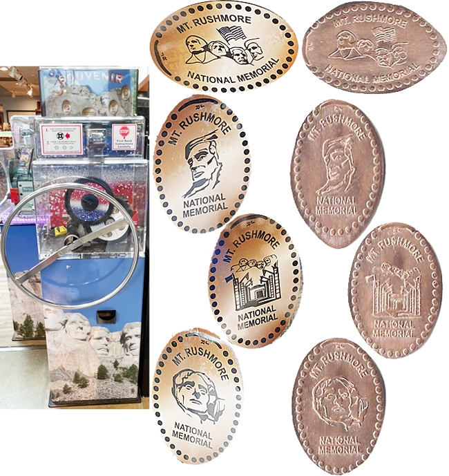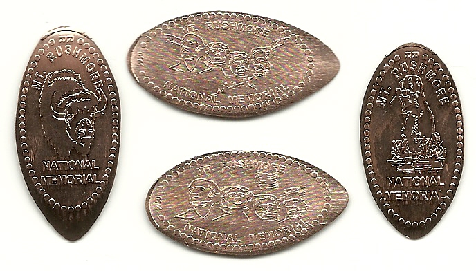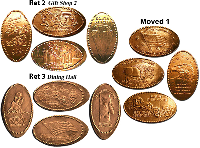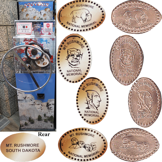 Active penny Machines 10, 11 and 12 cost to press: 51¢ each design. All have 'JR' at the catch notch, 'Mt. Rushmore National Memorial' on the front and are mules with 'MT Rushmore South Dakota' on the reverse side.