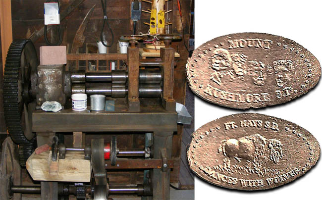 Two pennies are offered during the season that are made on converted antique equipment. The penny must be grasped by pliers and fed through rollers just right to press.