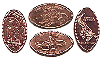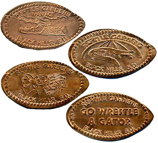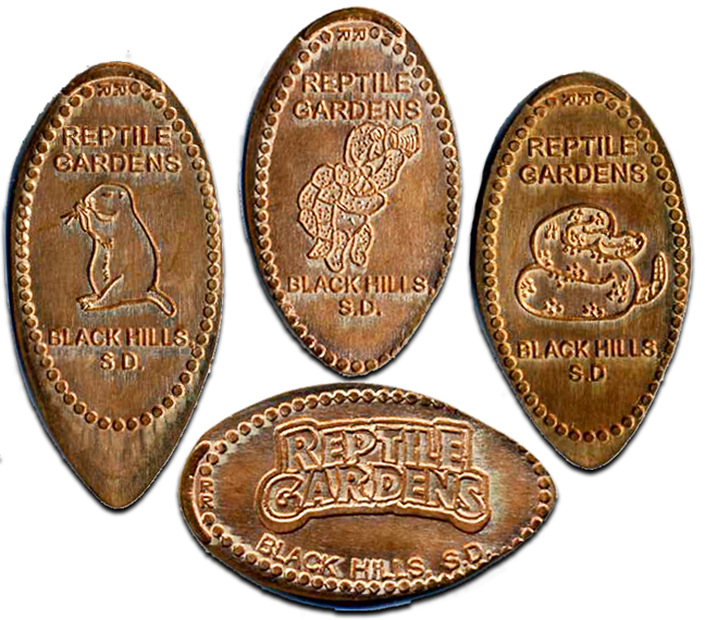 There are 8 pennies and 1 dime elongated coin designs available from Reptile Gardens. All read Reptile Gardens Black Hills, S.D.