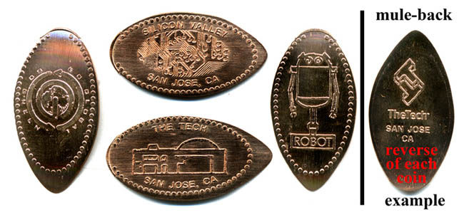 Retired 1: Backs 'The Tech San Jose, CA'. Designs are: 1) Robot, 2) 'Go Global, Go Green', 3) 'Silicone Valley San Jose, CA', 4) 'The Tech San Jose, CA'.