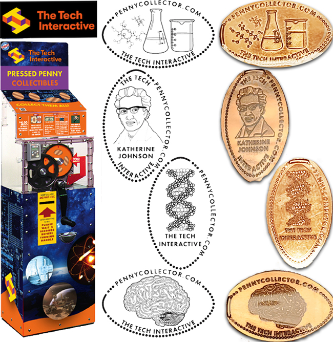 Retired Token machine 1: 1) 'Engineering, Technology, Science, Math', four sections with name related objects, 2) 'Build Your Own Social Robot', lots of squares with objects inside., 3) 'Technology Innovation', lightbulb, 4) 'San Jose Sylicone Valley', image of Tech Museum building.