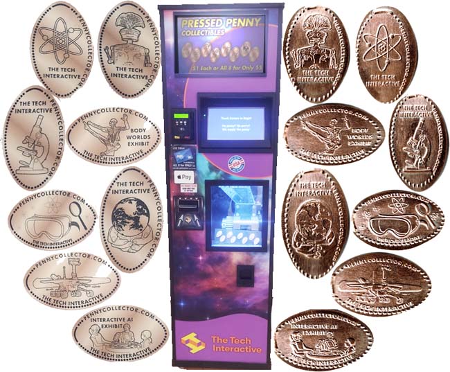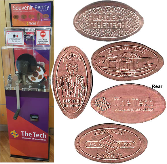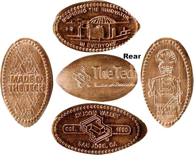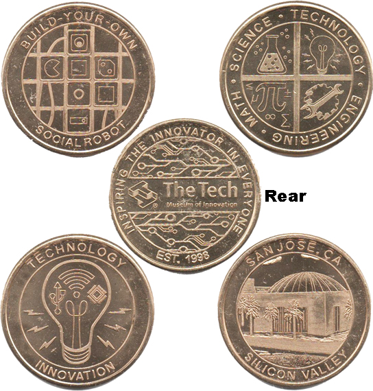 Retired 2: Rear: The TECH Museum of Innovation' logo/ Dot border set) Designs are: 1) BUSTER the robot, 2) MADE @ THE TECH, 3) Silicon Valley San Jose, CA (Est. 1980), 4) Inspiring the Innovator in Everyone