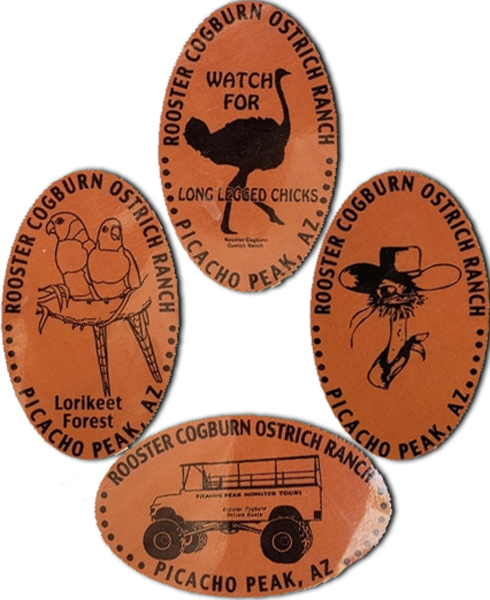 The machine is right by the squirt-gun shooting area by the entrance. All have 'Rooster Cogburn Ostrich Ranch Picacho, AZ' on them. Designs are: