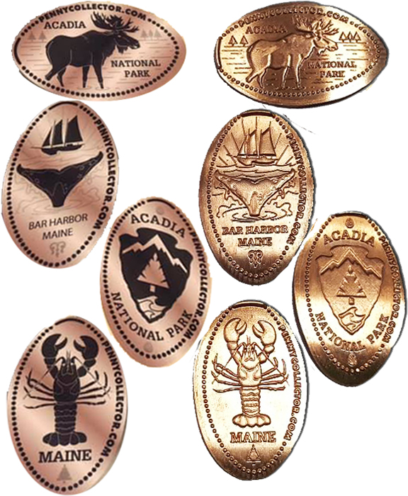 The penny machine is outside by front door or inside by the front door on bad weather days. Cost to press: 51¢ each design. Designs all with 'PennyCollector.com':