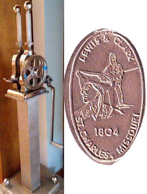 Machine 1 is an attended machine that has no public access. The pre-pressed penny is available in the gift shop. Cost to purchase, 50 ¢ each design. Design has a solid ringed border and 'EB' at the catch notch: