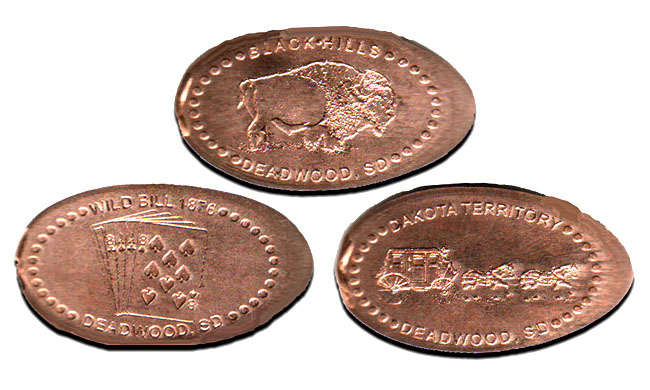 A 3 - Die Wooden Electric Machine is located in the Shoppe along a Historic Walk in the Bank Vault. Designs: All say DEADWOOD, SD on the bottom. Designs are: