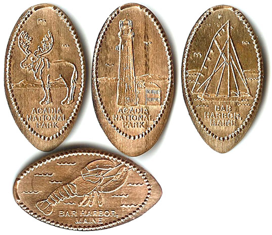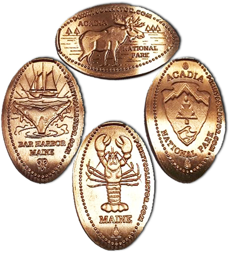 Moved 3: 1) 'Arcadia National Park', Arrow logo, 2) 'Bar Harbor Maine', Whale tail and sail boat, 3) 'Arcadia Natiuonal Park', Moose, 4) 'Maine', Lobster.