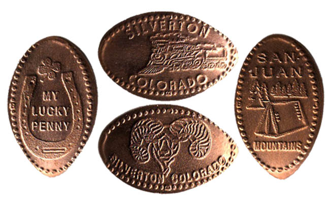 Designs: 1) Big Horn Sheep (head) "Silverton Colorado", 2)Train "Silverton Colorado", 3) "My Lucky Penny" horseshoe & 4-leaf clover, 4) "San Juan Mountains" tent & trees. |