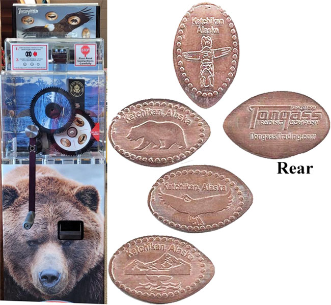 Machine 1 is to the left of entrance on first floor, as you enter store from the pier. Cost to press: 51¢ each design. Designs all have 'KL(?)' at the catch notch and a beaded border with 'Ketchikan Alaska':