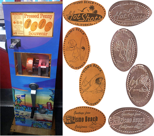 Machine 1 (Placed 8/18) is inside to the right, inside the gift shop toward the pool tables. Cost to press: 51¢ each design. Designs all have a beaded border with 'Pismo Beach California':