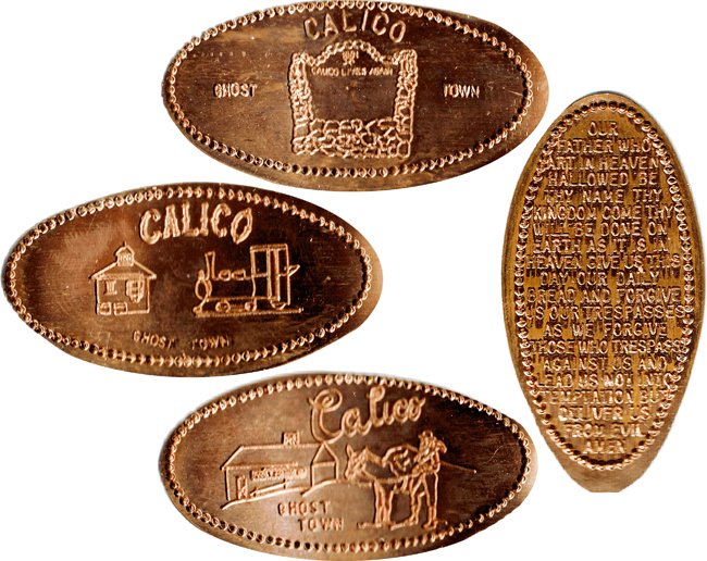 Retired designs (Pre-2000s/ Attended Machine): 1) 'Calico Ghost Town', barn with miner and Mule, 2) 'Calico Ghost Town', Train engine & building, 3) 'Calico Lives Again, Calico Ghost Town', rock entrance structure, 4) The Lord's Prayer.