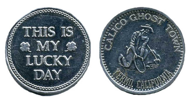 Retired 3 (Dime) two-sided design: 1. (H) Miner wearing a lighted hat pushing an ore cart with 'Calico Ghost Town Calico, CA', Reverse: 'Calico Print Shop 760-254-1144'.