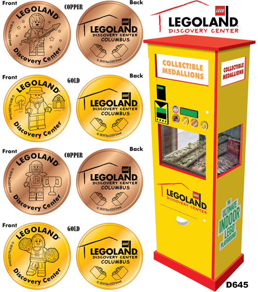 Token Machine 1 all have 'Legoland Discovery Center' on the fronts and the 'Legoland Discovery Center Columbus' logo on the back with two logos. Designs are: