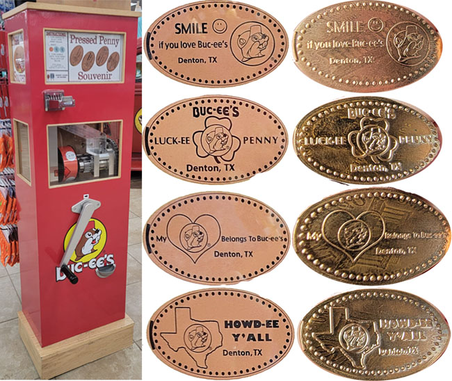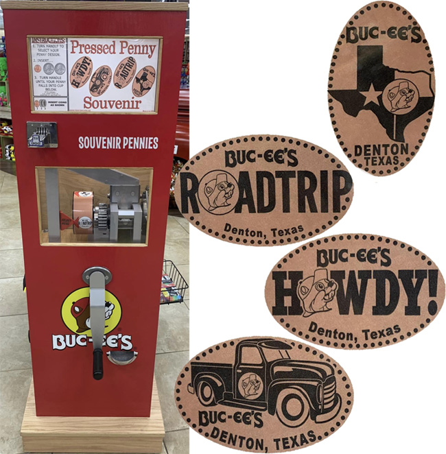 Machine 2 is near located in the middle of the floor between the toy section and the food area. All have Buc-ee's Denton, TX" on them. Designs are: