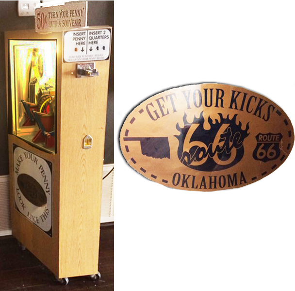 1) 'Get your kicks Oklahoma', image of state, Route 66 in flame, Route 66 sign, with saying top and state name bottom.