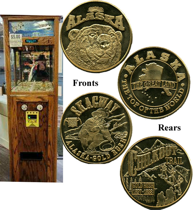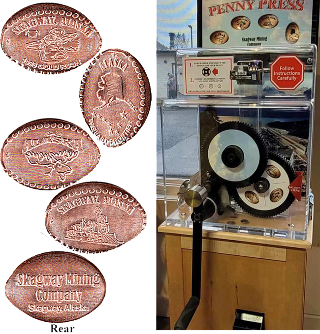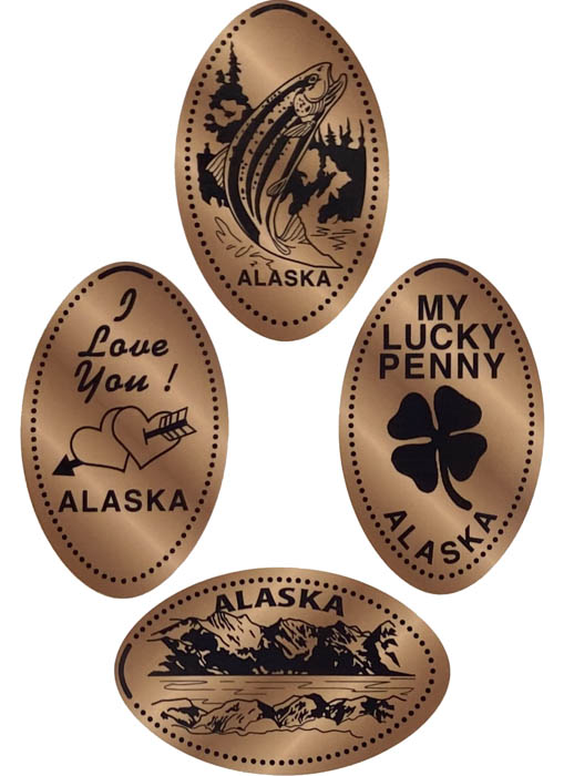Machine 3 Is inside the store. Cost to press: 51¢ each design. Designs all have a beaded border with 'Alaska':